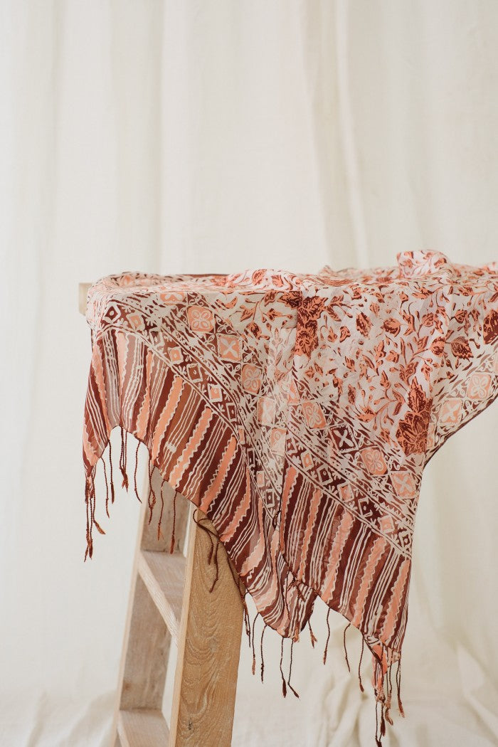 A perfect blend of traditional craftsmanship and contemporary style. Made from silk fabric, each scarf is hand-dyed and hand-stamped ensuring a unique and beautiful design. Wear it as a scarf, shawl, or wrap to add a touch of elegance to any outfit.