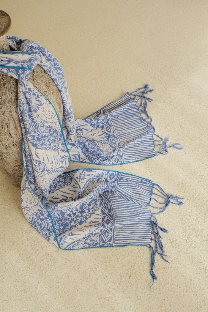 Emphasizing both style and sustainability, this Batik-stamped scarf effortlessly elevates your outfit. Whether draped casually over your shoulders or wrapped snugly around your neck, it's the perfect addition to any outfit, showcasing your appreciation for time-honored artisanship and timeless elegance.