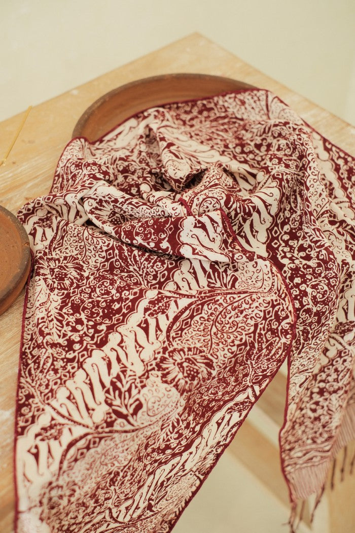 Emphasizing both style and sustainability, this Batik-stamped scarf effortlessly elevates your outfit. Whether draped casually over your shoulders or wrapped snugly around your neck, it's the perfect addition to any outfit, showcasing your appreciation for time-honored artisanship and timeless elegance.