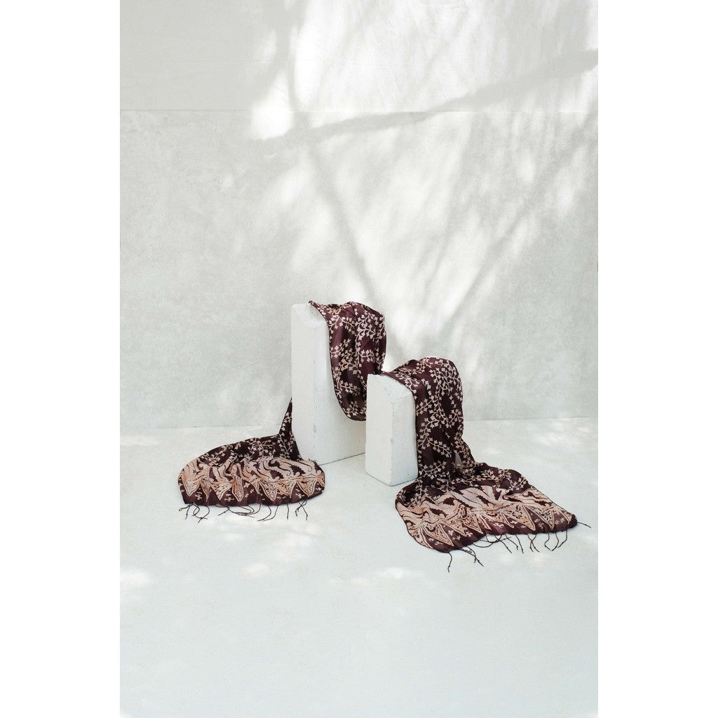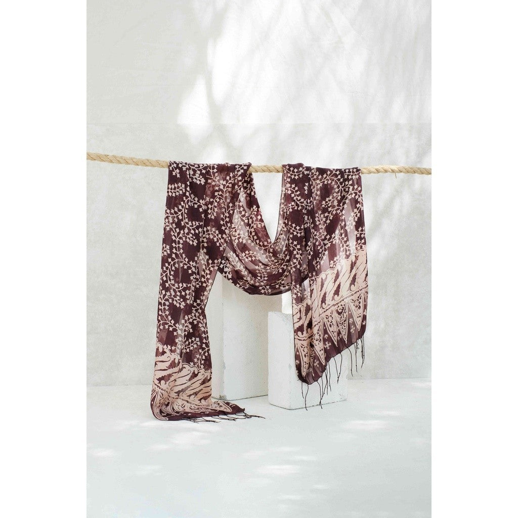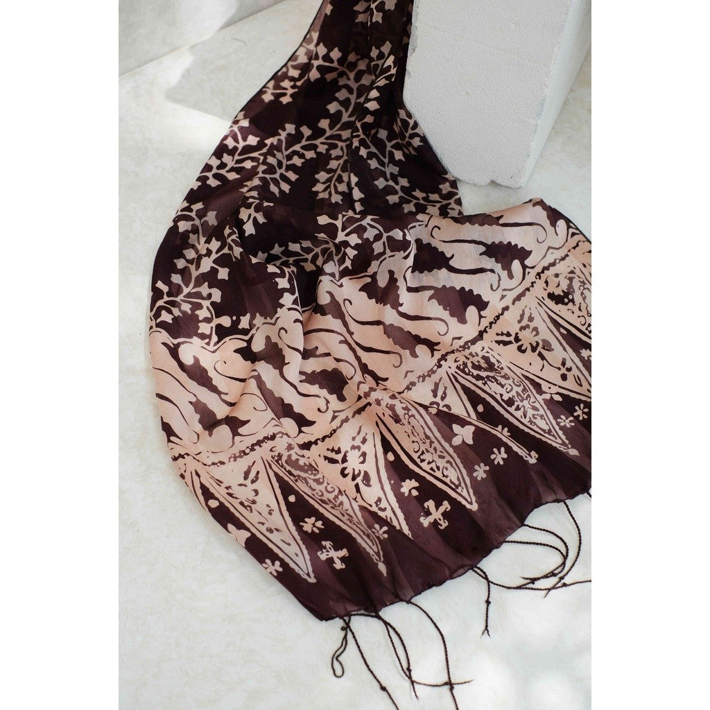 A perfect blend of traditional craftsmanship and contemporary style. Made from silk fabric, each scarf is hand-dyed and hand-stamped ensuring a unique and beautiful design. Wear it as a scarf, shawl, or wrap to add a touch of elegance to any outfit.