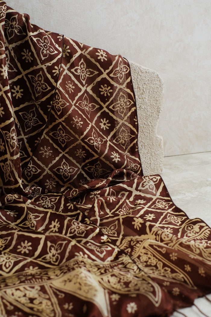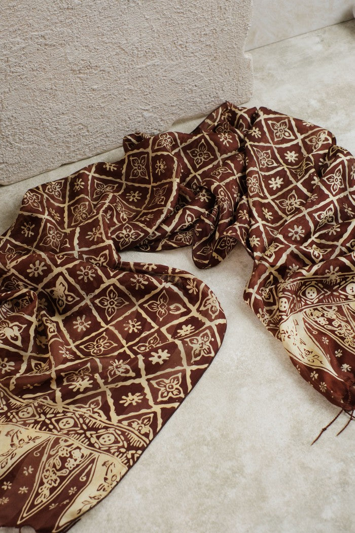 Emphasizing both style and sustainability, this Batik-stamped scarf effortlessly elevates your outfit. Whether draped casually over your shoulders or wrapped snugly around your neck, it's the perfect addition to any outfit, showcasing your appreciation for time-honored artisanship and timeless elegance.