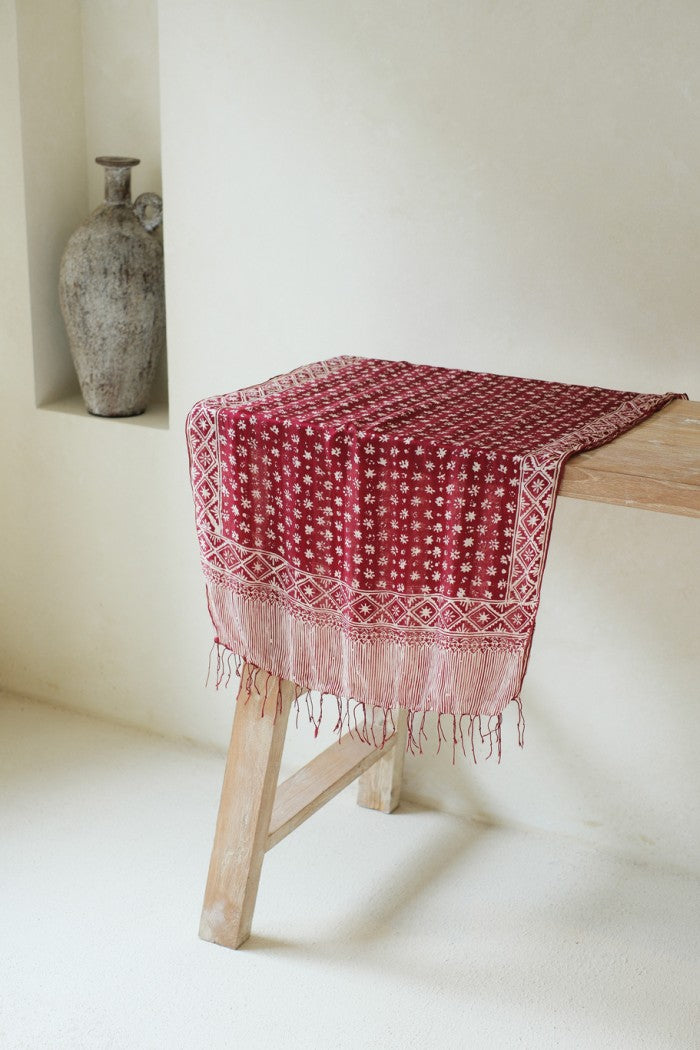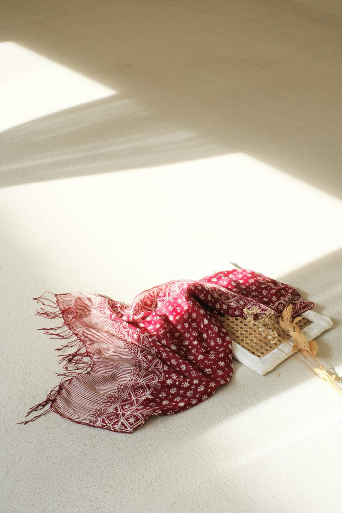 A perfect blend of traditional craftsmanship and contemporary style. Made from silk fabric, each scarf is hand-dyed and hand-stamped ensuring a unique and beautiful design. Wear it as a scarf, shawl, or wrap to add a touch of elegance to any outfit.